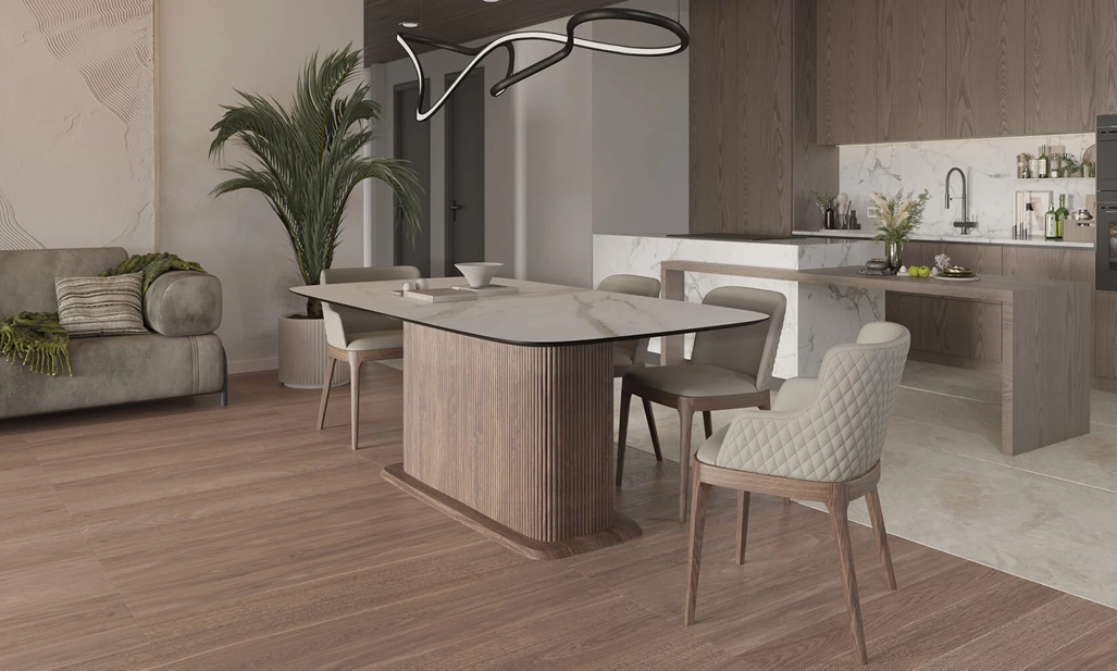 Он оснащен прямоугольной столешницей, выполненной из керамики, что обеспечивает прочность и устойчивость к царапинам и пятнам.